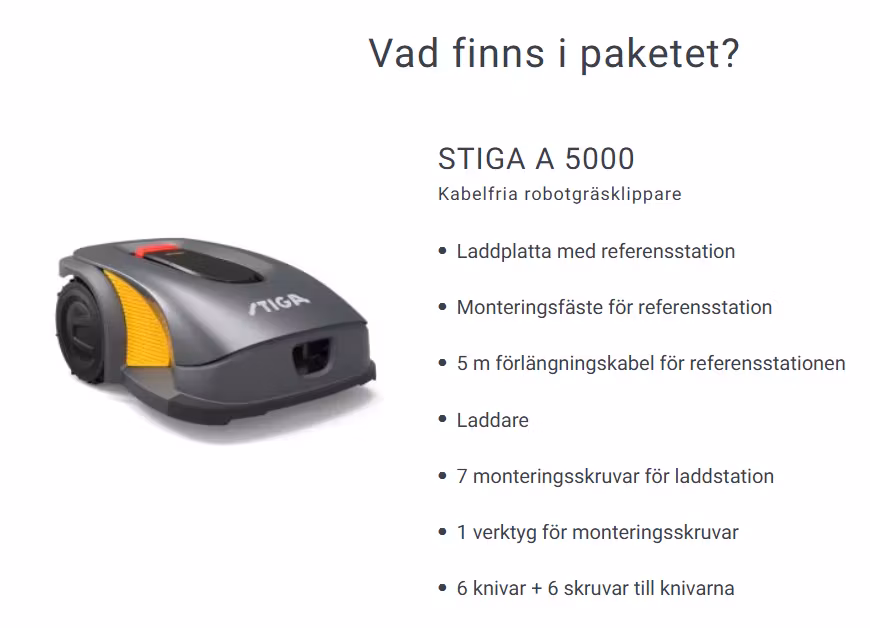 Den kabelfria robotgräsklipparen STIGA A 5000 levereras med ett 4200 timmars datapaket (för användning inom de första tre åren) som gör att roboten kan utföra sitt arbete. När det medföljande datapaketet är slut köps fler arbetstimmar separat, via appen.